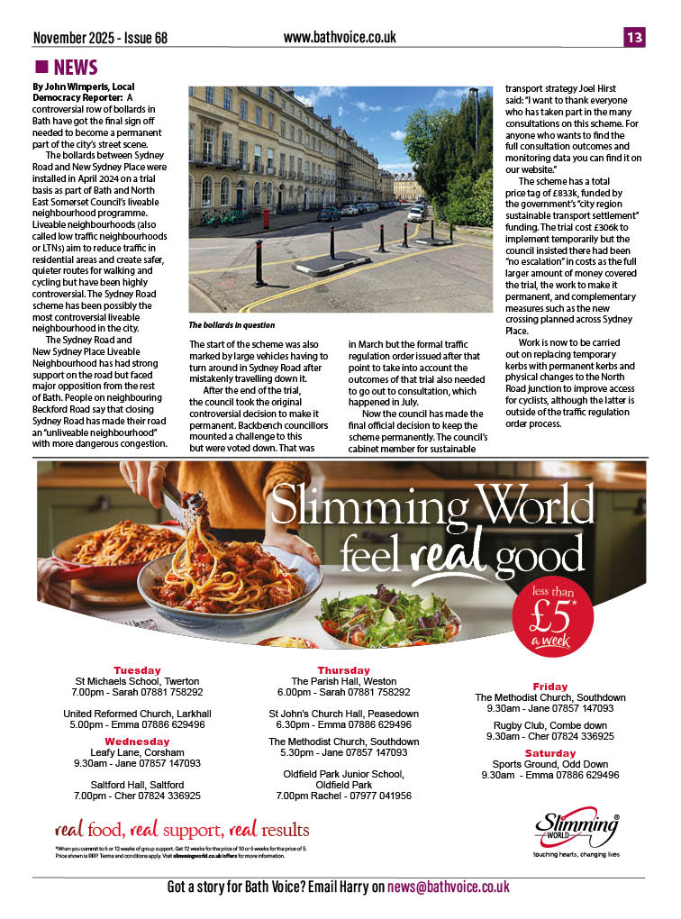 Bath Voice Monthly Newspaper is distributed free to thousands of homes and some supermarkets – distributed from the first of the month. Harry Mottram is the News Editor