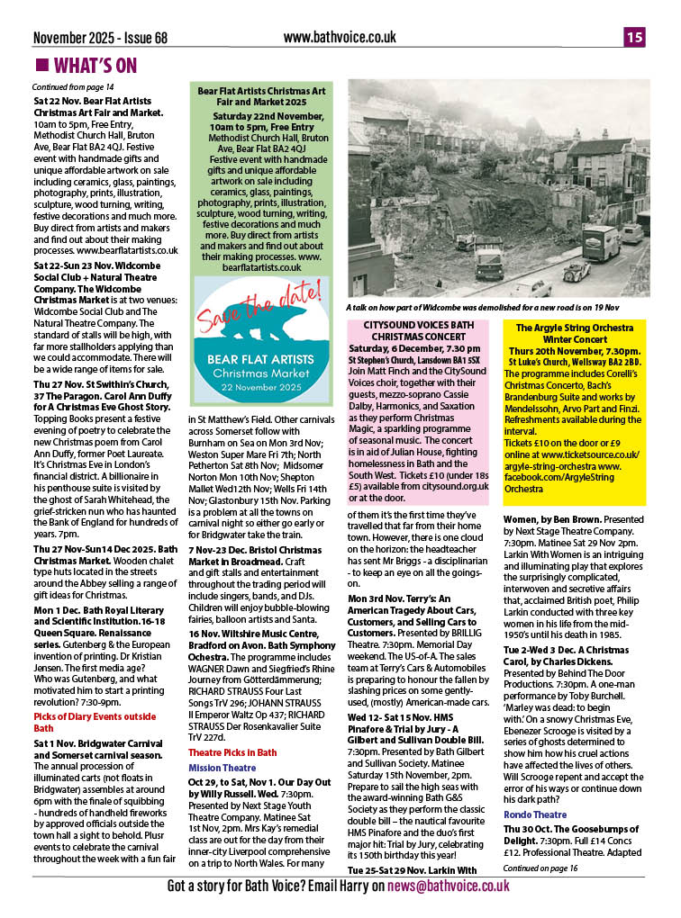 There’s news on HMOs, the fire station and the fall out of the plans to build a new rugby stadium at the Recreation Ground. Puzzles, book reviews, letters – there’s plenty to inform and amuse inside along with what’s on and news from the world of the theatre with Christmas just weeks away.