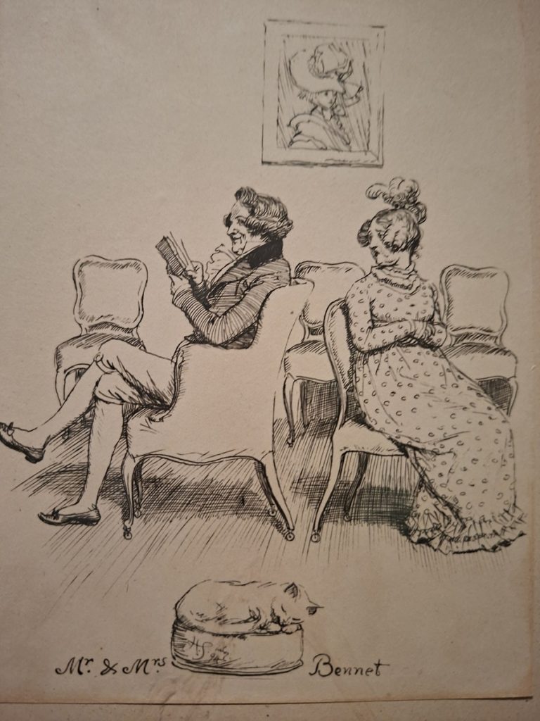 What follows are some exceptional illustrations – some in watercolour and others in pen and ink beginning with the brothers Charles and Henry Brock who illustrated novels by Gaskell, Dickens and Austen with their comical illustration from Sense and Sensibility with its Regency costumes and expression of Mr Robert Ferrars a delight. Christina Hammond’s pen and ink drawing of 1899 entitled ‘Oh Elinor! She cried. I have such a secret to tell you about Marianna,’ is superb – she was a member of the Cranford School – but died far too young at the age of 40. Hugh Thomson’s illustration of Mr and Mrs Bennet sitting in chairs facing in opposite directions sums up the couple but also perhaps, the majority of married couples of a certain age – note to self – don’t be so cynical.