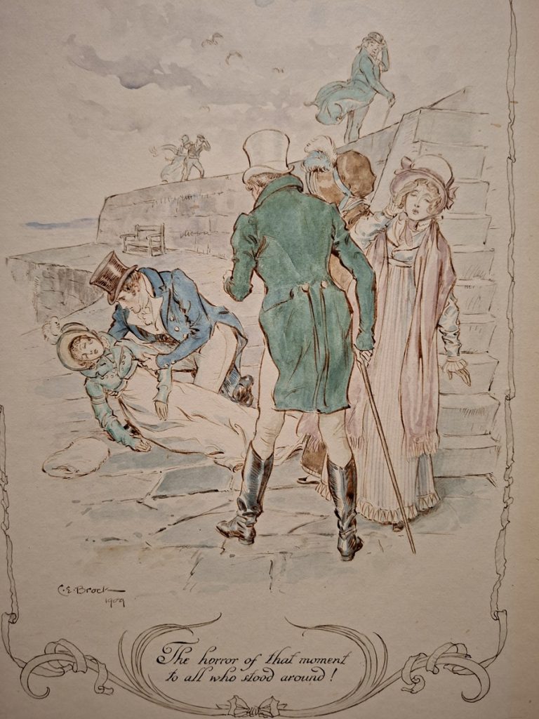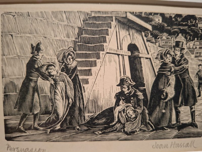 Rex Whistler’s costume designs for a production of Pride and Prejudice in 1936 of Charlotte Lucas and Lady Catherine de Bourgh reveal that Austen mania is nothing new. The finely drawn and classic Empire line gown is delicate and perfect for Charlotte depicted in pen. Although not a large exhibition each image is precious and tells a story – which of course is what they were designed to do. Hugh Thomson’s ‘Fanny Price and Henry Crawford’ from Mansfield Park in ink evokes the scene while Charles Edmund Brock’s illustration from Persuasion of Louisa’s fall from the sea wall in Lyme Regis is also repeated – this time by Joan Hassall in the 1960s in a wood engraving.