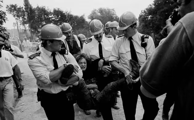 Back to the 1990s: Adrian Arbib’s photographs document the clash between protesters armed with rope harnesses and mobile phones and private security guards Photograph: Adrian Arbib