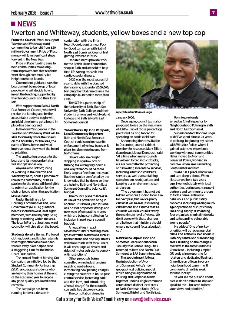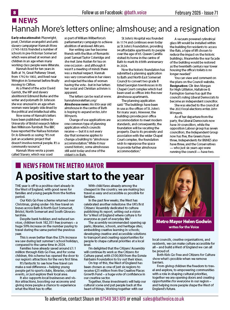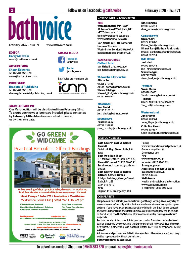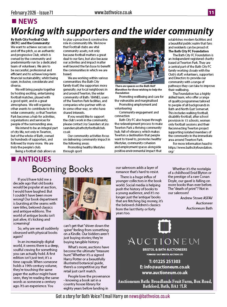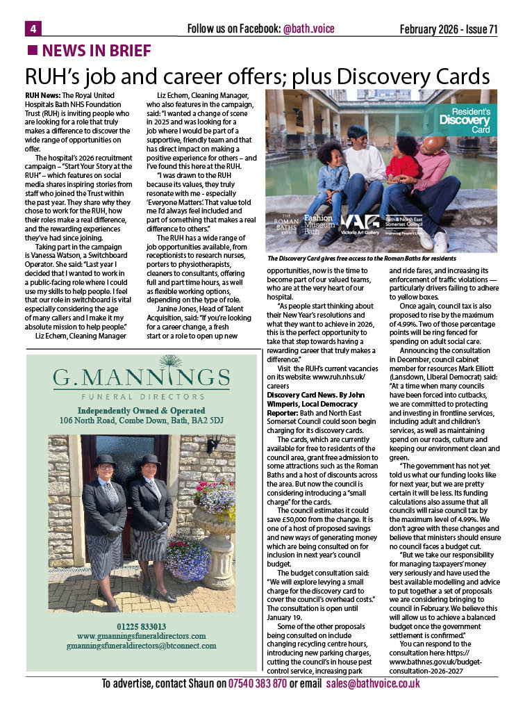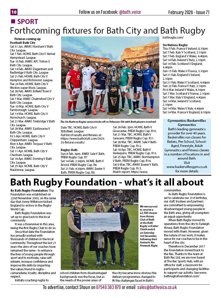 By Harry Mottram: The latest edition of Bath Voice – the city’s leading monthly newspaper is out now with features, letters, sport, what’s on, news and views – plus much more. It is free to thousands of homes in Bath and is available from selected outlets such as shops and libraries. On our website and social media we post regular news and sports results – on a daily basis – so ensure you follow Bath Voice online: