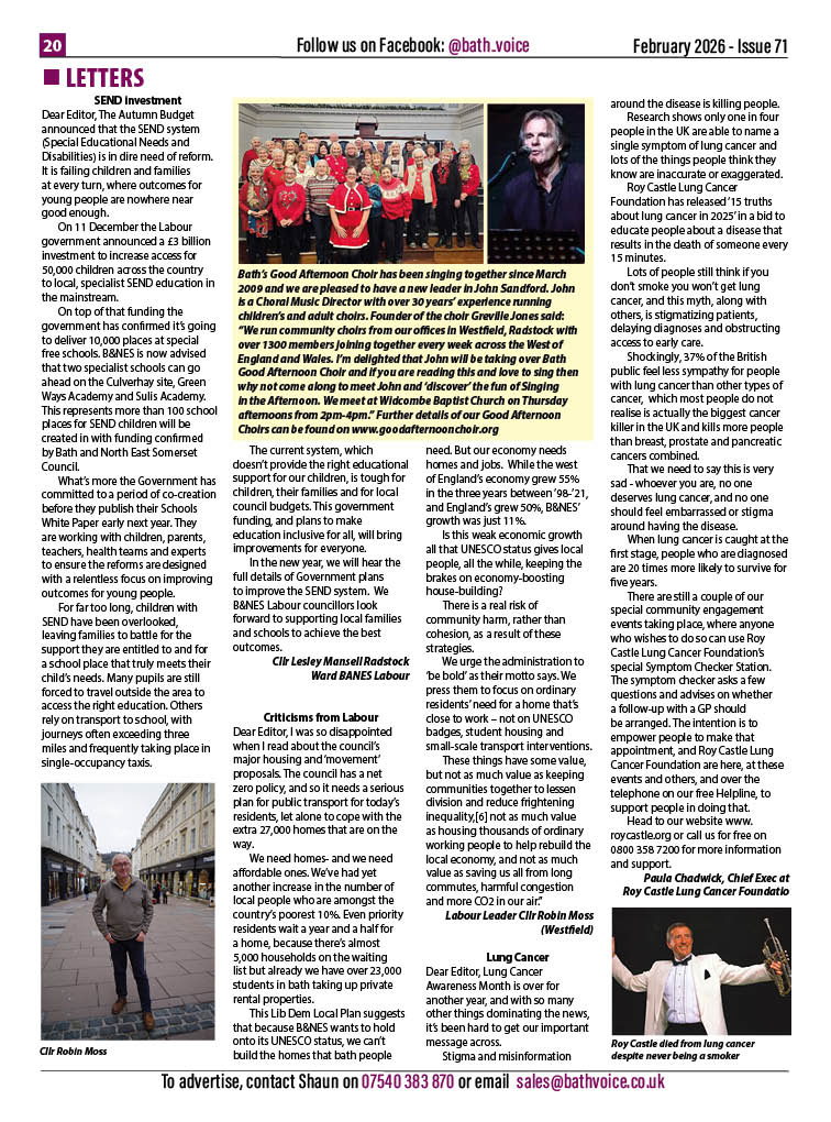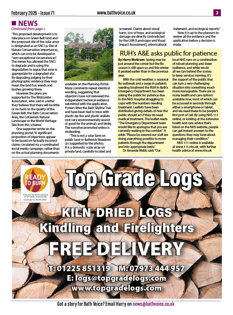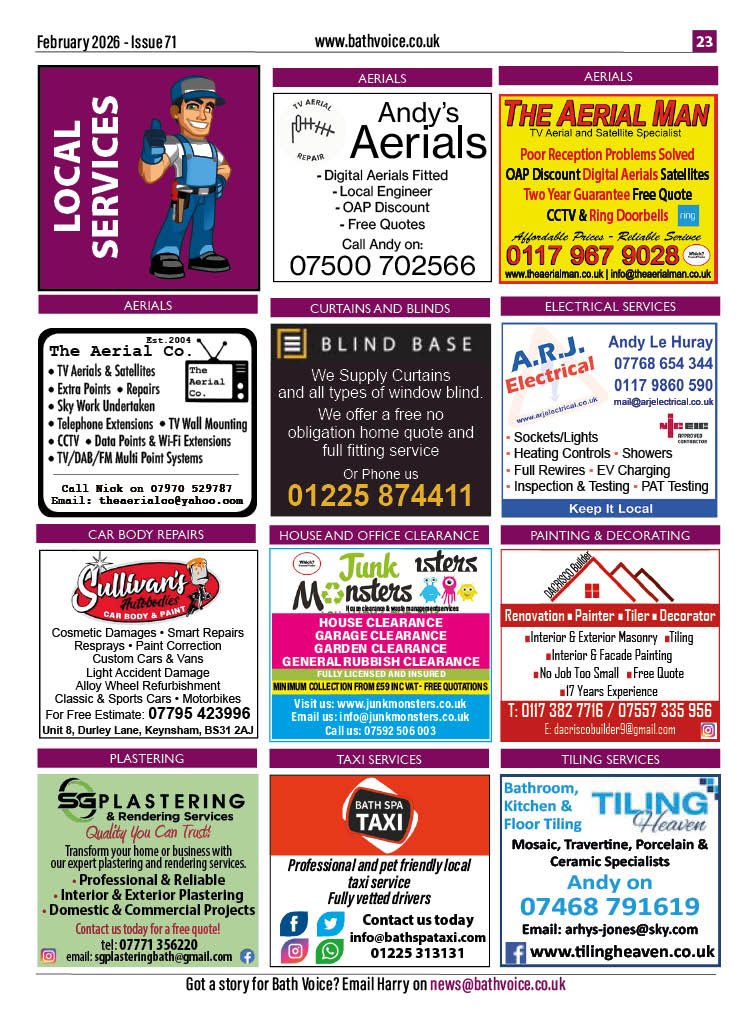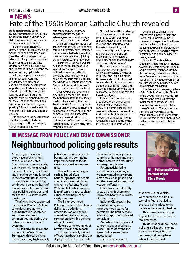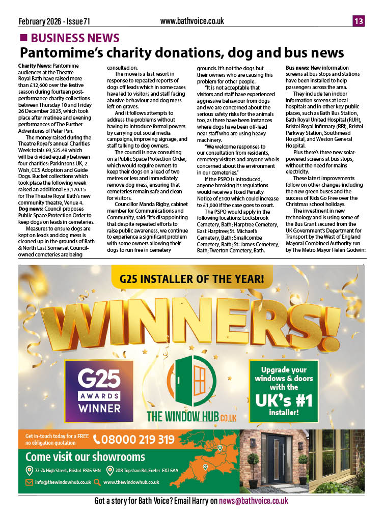 By Harry Mottram: The latest edition of Bath Voice – the city’s leading monthly newspaper is out now with features, letters, sport, what’s on, news and views – plus much more. It is free to thousands of homes in Bath and is available from selected outlets such as shops and libraries. On our website and social media we post regular news and sports results – on a daily basis – so ensure you follow Bath Voice online: