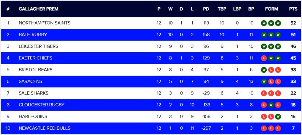 They next have Northampton Saints on Friday 10th April in an Investec Champions Cup – Quarter-final at 8pm KO; and on Saturday 18th April an English Gallagher Prem game Bath Harlequins, at 17:30pm – also at the Rec. In the Prem they sit one point behind Saints having had three wins from the last three games. To be champions they need Saints to slip up and for Bath to get maximum points in their remaining games – seeing off Leicester in June if possible.